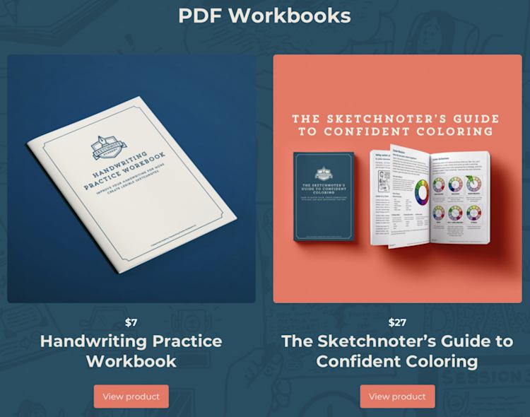 Emily sells two PDF workbooks as digital downloads on her Podia site: Handwriting Practice Workbook and The Sketchnoter’s Guide to Confident Coloring. Aspiring sketchnoters can buy the workbooks on their own or can use them to supplement Emily’s courses and workshops.