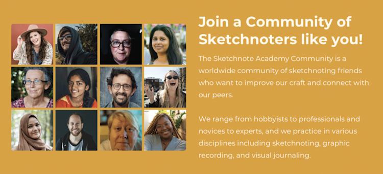 The Sketchnote Academy Community is free to join and offers a place for sketchnoters to connect, collaborate, request and offer feedback, and interact with Emily.