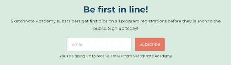 She includes an email capture form across her Podia site, motivating visitors to join Emily’s email list for first dibs on new programs and products.