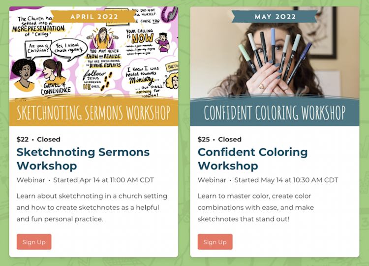 Emily uses Podia’s webinar feature to sell one-off workshops on a variety of sketchnoting topics, from sketchnoting a holiday card to sketchnoting sermons.
