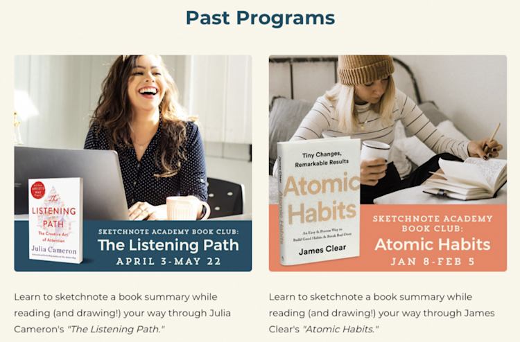 Emily has used the cohort format to host two book clubs so far. Cohort members learned to sketchnote a book summary while reading (and drawing) their way through a book together.