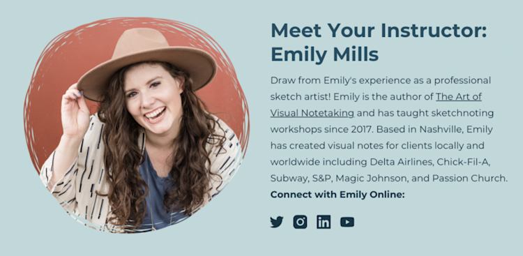 Emily’s other self-paced courses include Introduction to Sketchnoting (Free), Intermediate Sketchnote Drawing ($37), and Master Your Visual Library ($25).