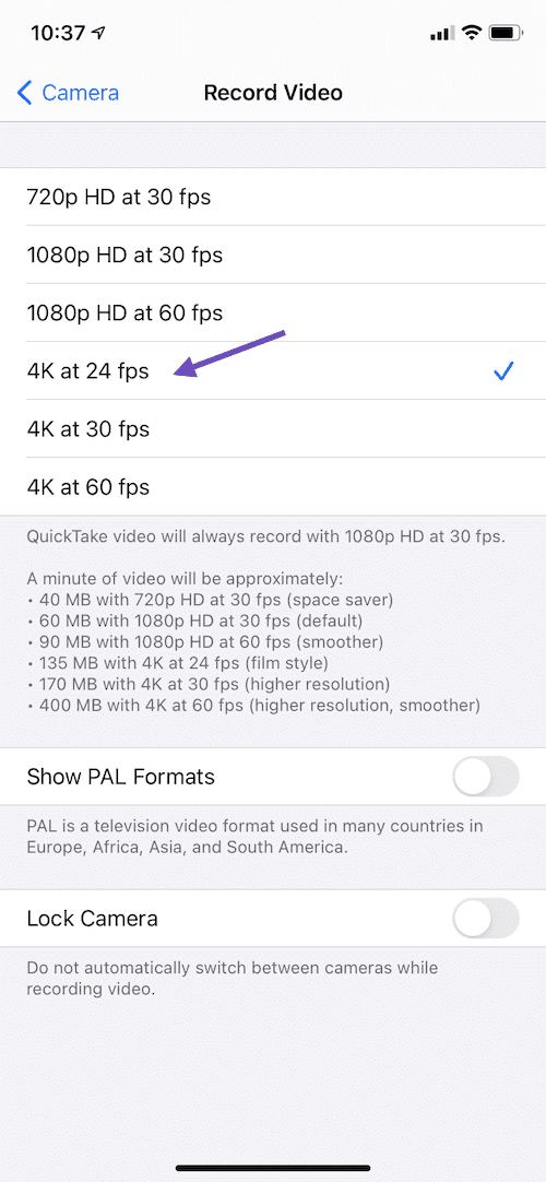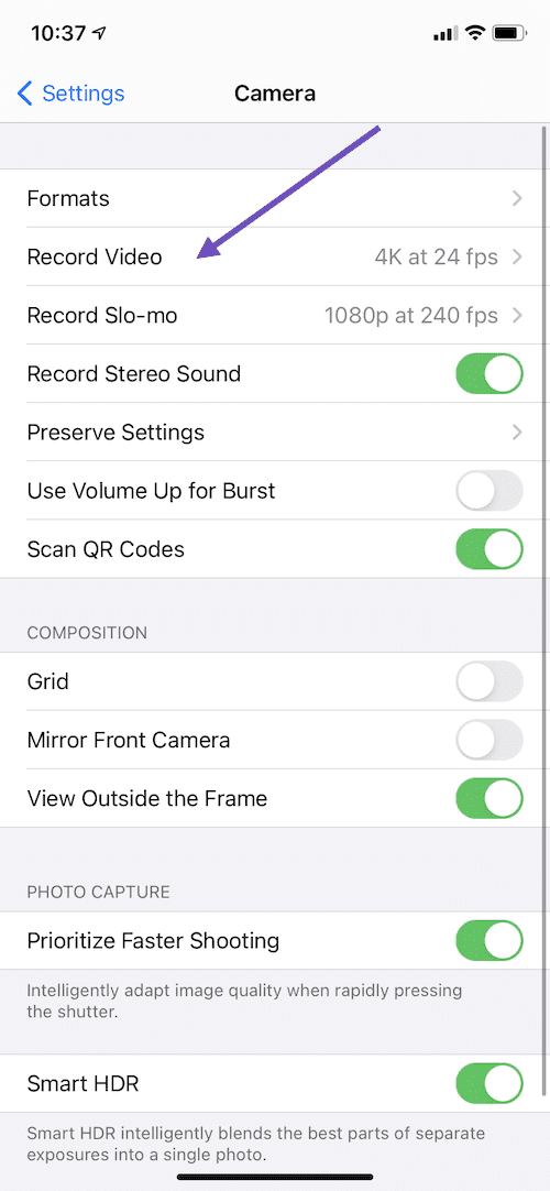 By default, the iPhone records video at 30 frames per second (fps). Depending on your model, you can choose other frame rates and video resolution settings.
