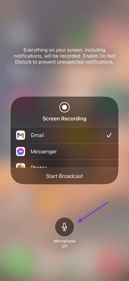You can also record audio during the screen recording by holding down the recording button, then tapping the microphone icon. Some apps, such as FaceTime, might not allow you to record audio.