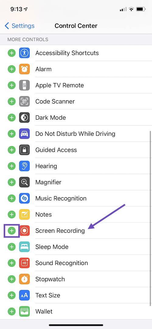 First, you need to add screen recording to your phone’s Control Center. To customize controls, go to your iPhone Settings, then tap “Control Center”. Tap the green plus sign next to "Screen Recording" to add it to your Control Center.