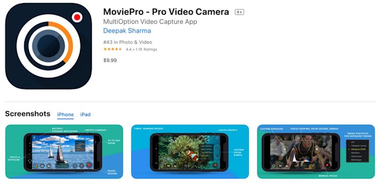 Another highly rated camera app is MoviePro. It offers manual controls and presets for nearly every camera setting, plus audio recording features like on-screen audio meters and Bluetooth microphone compatibility.