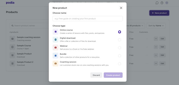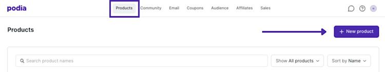 In your Podia dashboard, navigate to the “Products” tab and click “New product”.