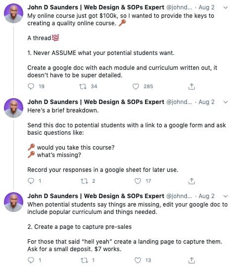 For John, this meant pre-selling the course idea to his Twitter audience and validating his product idea before even creating it.