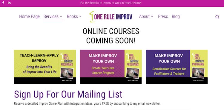 One Rule Improv, for instance, manages to provide teaser content within their upcoming course titles and subheadings, which are embedded into small graphics.