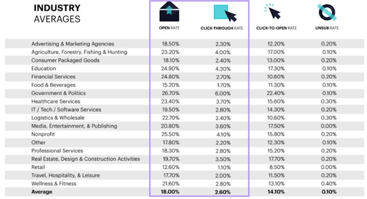 If you’re looking for benchmarks to follow, according to Mailchimp, the average open rate is 21.33%, and the average click rate stands at 2.62% for all industries.