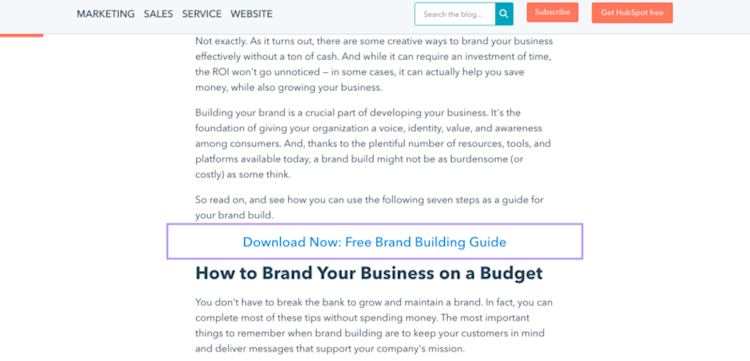 Like Hubspot’s Free Guide: How to Build a Brand landing page, which I accessed from their 7 Steps to Branding Your Business on a Budget blog article.