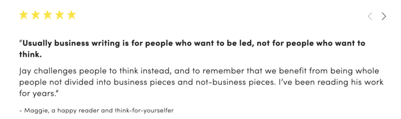 All in all, the feedback on Jay’s homepage focuses on several different parts of his business, from his keynote speeches to his book and podcast.