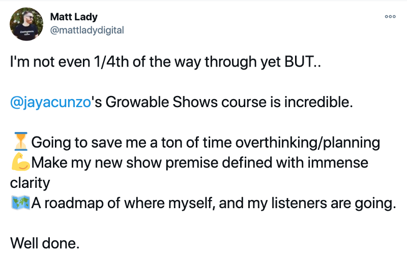 Jay Acunzo also uses testimonials on the online course sales page for Growable Shows, his online course for aspiring podcasters: