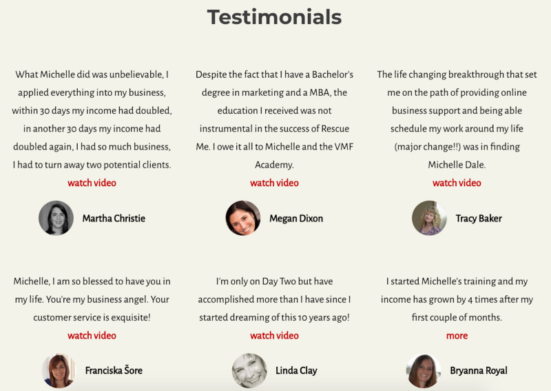 Video testimonials and detailed customer stories show how different people have found success through Michelle’s programs. This helps potential enrollees realize, “That could be me.”