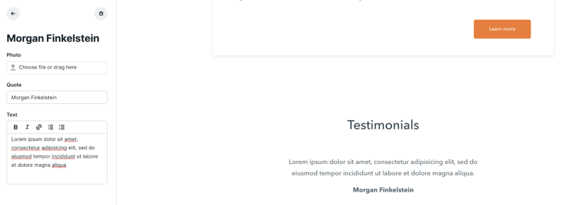 You can change the heading for your testimonials section and add a call-to-action button. To add a new testimonial, click “New testimonial”.