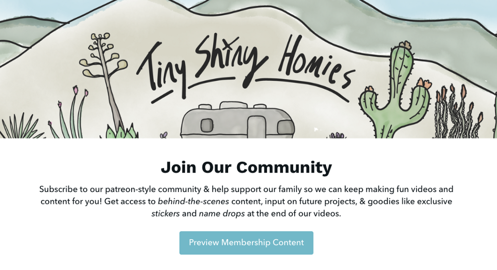 In addition to digital products and YouTube ad revenue, Tiny Shiny Home earns money through a Patreon-style membership community hosted on Podia.