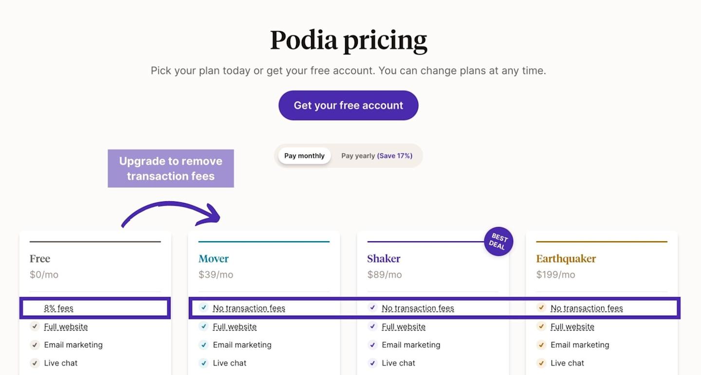 (You can remove all transaction fees with Podia's Shaker plan!)